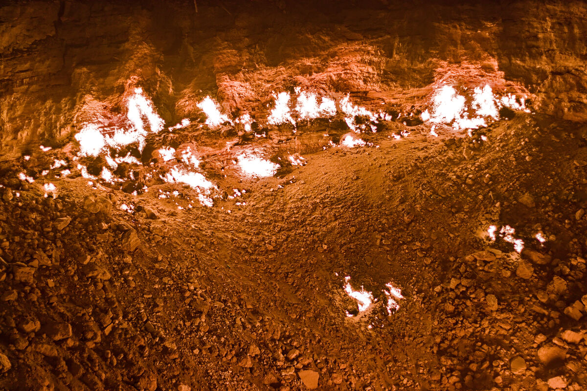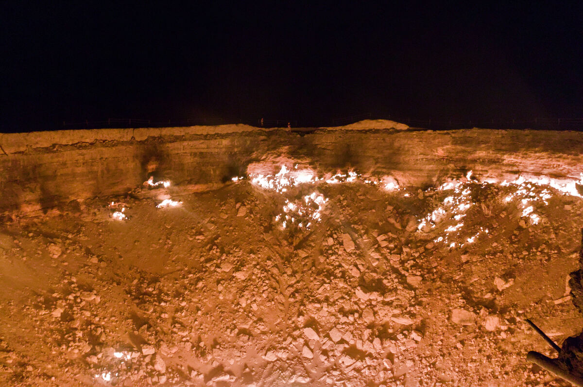 The story goes that a Soviet exploration looking for natural gas inadvertently created the sinkhole that has been venting methane ever since. In an attempt to manage the situation it was decided to burn off the escaping gas. Exactly when and how this all happened is disputed, but it has been on fire for decades and shows no sign of burning out.